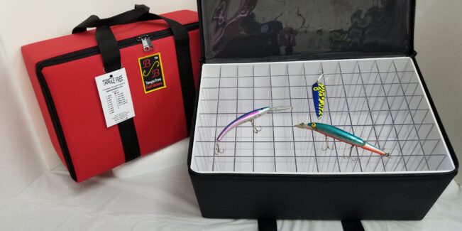 • The lure storage cases are constructed for durability. The outer case is made of a tightly woven water and hook resistant padded material, with a heavy duty dual zippered closure. For convenience in carrying there are black nylon web straps.