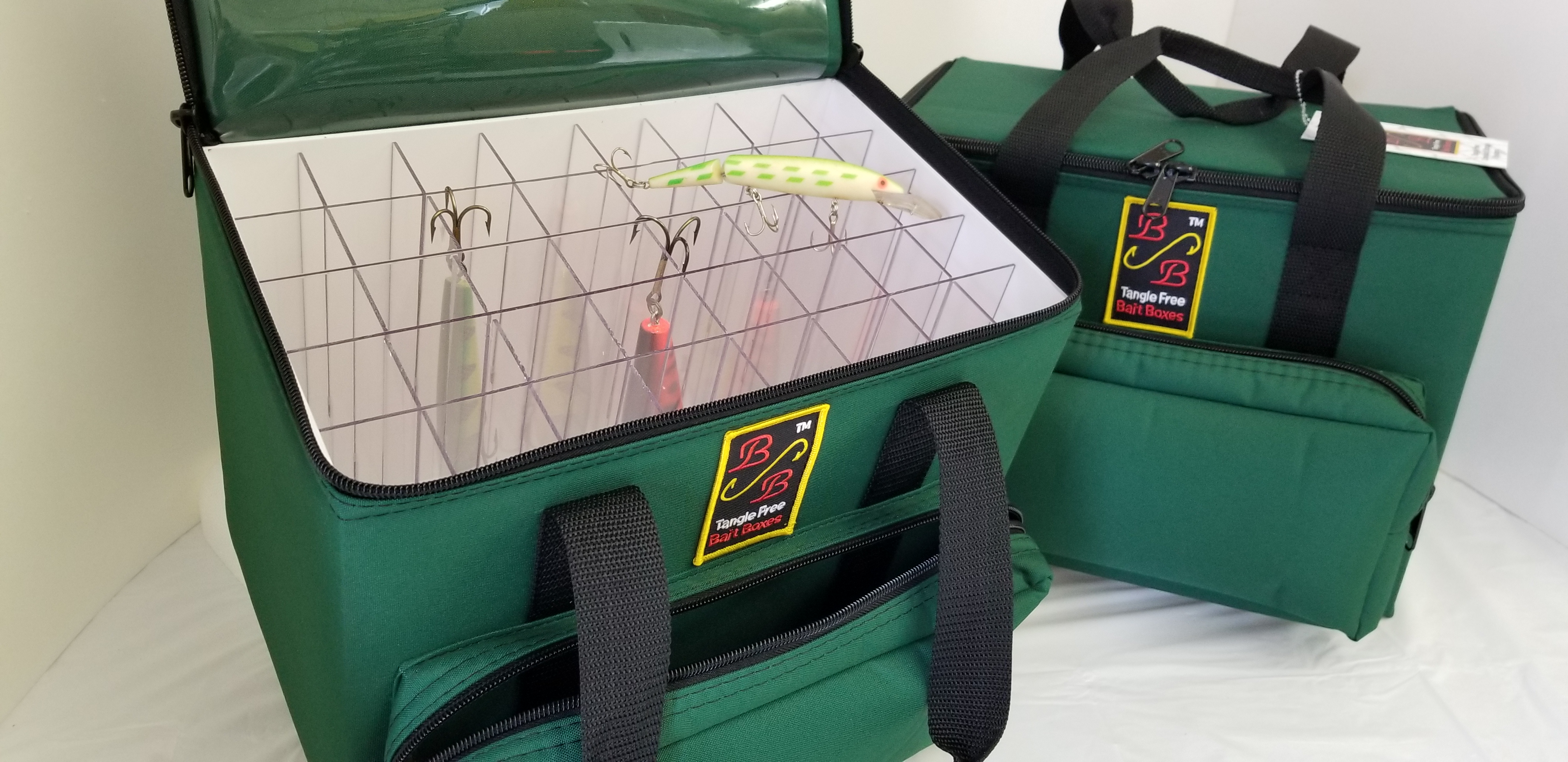 40 vertical compartments 9.80″ high grid, perfect for small to medium sized musky lures. Outside zippered front pocket, large enough to fit a #3600 Plano (not included.)  Each compartment size is:  1.696″ X 1.649″   Inside vinyl map pocket on cover.